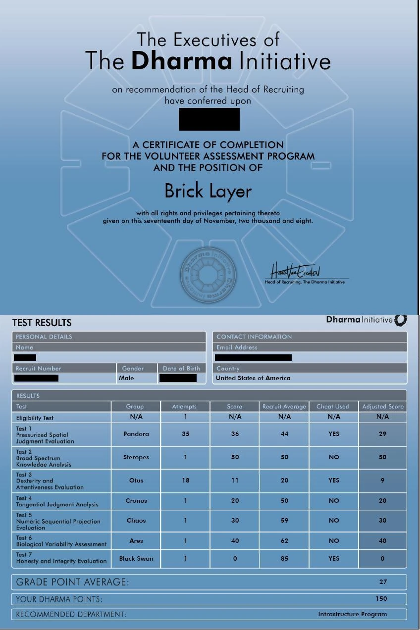 Los dossieres de las evaluaciones fueron publicados el 18 de noviembre de 2008 en DharmaWantsYou.com. En ellas aparecen el nombre, trabajo, resultados de los tests, etc. de cada recluta.