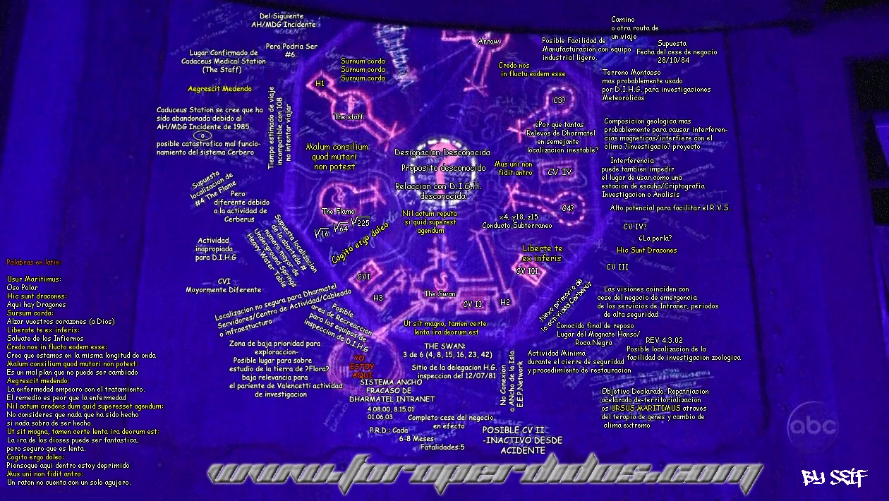 El antiguo habitante de El Cisne Radzinsky comenzó el mapa, ampliándolo sólo cuando las compuertas blindadas estaban bajas, durante cierres. Él y su compañero Kelvin Joe Inman manipulaban regularmente el sistema para iniciar cierres que les permitieran pintar el mapa, sólo visible con luz negra (ultravioleta). ("Live Together, Die Alone - Part 2") Tras la muerte de Radzinsky, Kelvin continuó el mapa, aunque a un ritmo mucho más lento. Le contó a Desmond que él no poseía la memoria fotográfica de Radzinsky, que le permitía recordar exactamente dónde se había quedado.