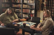 Quelqu'un sonne soudain à la porte et Sawyer se dirige vers la fenêtre cassée. Il se rend compte que c'est Miles derrière la porte d'entrée et dégage les meubles qui la bouchent le temps d'attraper Miles et de le faire rentrer. A l'intérieur, ce dernier explique que les mercenaires l'ont délivré et qu'ils lui ont donné un talkie-walkie pour parler à Ben. Celui-ci refuse tout d'abord de leur parler, même en apprenant qu'ils ont un otage, mais change d'avis lorsque Miles indique qu'ils détiennent Alex.
