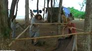 Charlie et Eko construisaient une église aux environs du camp. Eko a arrêté la construction pour appuyer sur le bouton, tandis que Charlie a continué tout seul pendant un moment. (Ces quatre-là)