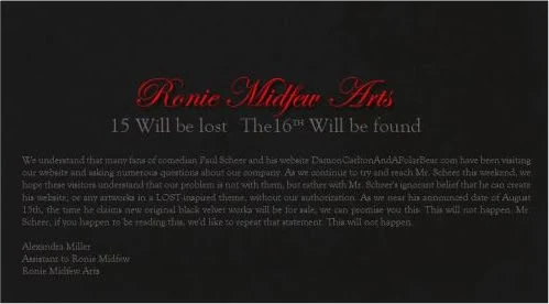 Sur le site de Ronie Midfew Arts, Roniemidfewarts.com, apparaît par la suite un message à l'attention des visiteurs, expliquant que Paul Scheer n'a pas le droit de créer des tableaux inspirés de LOST sans leur autorisation. Le site promet alors que la vente des tableaux le 15 août n'aura pas lieu.