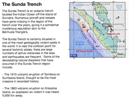 Sam Thomas découvre l'expression sunda trench dans une photographie retouchée de sa compagne. Il cherche ensuite sa signification sur www.findinfoout.com et découvre qu'il s'agit d'une fosse sous-marine. Sur la carte qu'il étudie, on peut voir une étoile rouge indiquant l'épicentre du tremblement de terre du 26 décembre 2004 qui a déclenché un gigantesque tsunami dans l'Océan Indien.