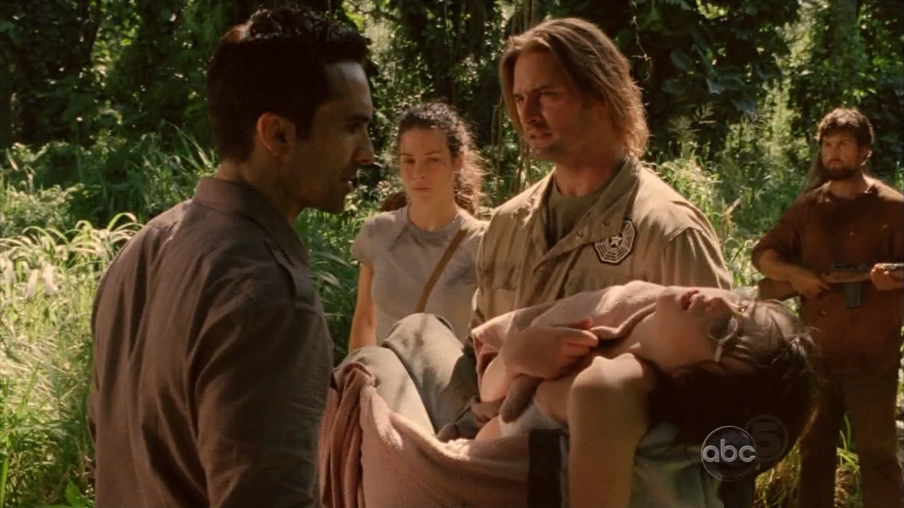 Un peu plus tard, Kate lui demande une arme en précisant que Claire pense avoir trouvé un endroit où il y aurait des médicaments pour Aaron. Après lui avoir donné l'arme, Sawyer propose alors de les accompagner mais elle refuse. (Congés de maternité)