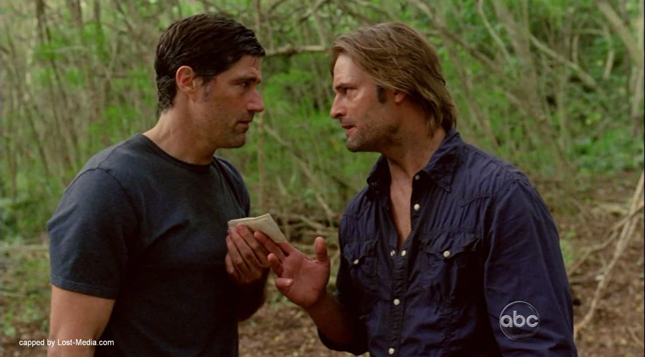 Quelques jours plus tard, Michael s'enfuit à nouveau pour reprendre Walt aux Autres. Jack et Locke décident de partir à sa recherche ainsi que Sawyer mais Jack refuse car il n'est pas rétabli de sa blessure. Sawyer répond qu'il aurait justement la possibilité de rester prés de son docteur. En chemin, Sawyer demande à Jack pourquoi il n'a pas voulu que Kate les accompagne. Jack est alors tendu et lui répond que tout le monde sait qu'il aime Kate (ce que Sawyer nie). Toujours en marchant, Locke demande à Sawyer pourquoi il a choisi le nom de Sawyer puis ajoute qu'il sait depuis le début que son vrai nom est James Ford. Sawyer répond que ce n'est pas ses affaires. La nuit, ils rencontrent un homme barbu que Sawyer reconnait comme étant l'un de ceux qui a enlevé Walt. Comme c'est également celui qui lui a tiré dessus, il veut se venger mais une balle sortie de nulle part lui frôle l'oreille et il abandonne. Après une longue discussion, Kate est capturée alors qu'elle suivait ses amis et est échangée contre les armes du groupe. (En territoire ennemi)