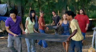 Les survivants regardent Hurley et Sawyer disputer une partie de tennis de table.