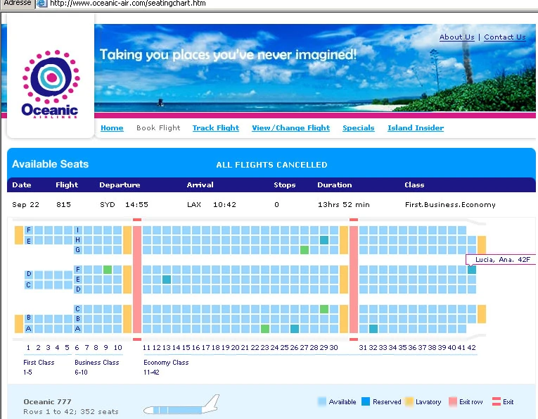 Tabela dos números dos assentos no website da Oceanic.