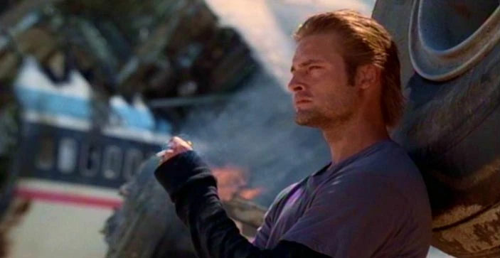 - [Sawyer acendendo um cigarro enquanto se encosta nas rodas do avião.]