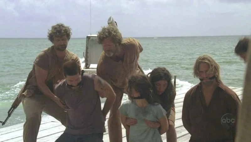 | ("Exodus: Parte 1") | Na cena que a jangada deixa a praia, após Sawyer levantar as velas, é visto um objeto preto na frente da jangada, possivelmente uma conexão mecânica para rebocar a jangada. | Posição da equipe |