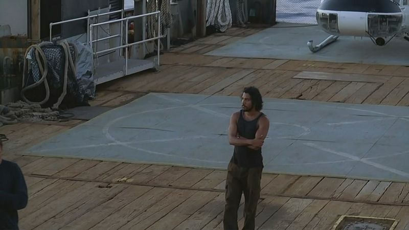 A tempestade passa e o helicóptero pousa no cargueiro. Keamy e Omar vêm correndo em direção a Frank, perguntando quem Desmond e Sayid são e porquê ele os trouxe com ele. Frank diz para ele que eles são sobreviventes do voo Oceanic 815. Desmond está angustiado e começa a gritar dizendo que não reconhece Sayid e Frank. Sayid tenta acalmá-lo, sem nenhum sucesso. Keamy diz que ele vai levar Desmond para a enfermaria para que o médico deles dê uma olhada nele, para então Sayid poder vê-lo de novo. Sayid concorda relutantemente. Enquanto eles vão pegar Desmond, que está na lateral do barco, ele tem um outro flash.