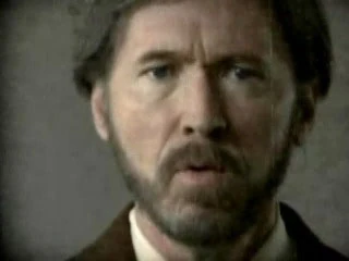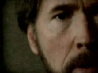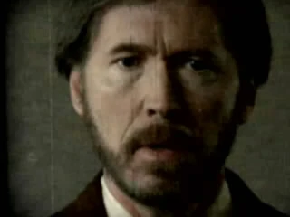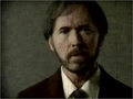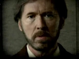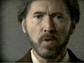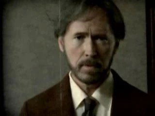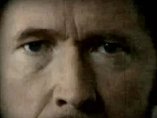 A câmera muda para uma visão em close da parte de cima do corpo de Alvar Hanso, que continua seu discurso sem se mover.