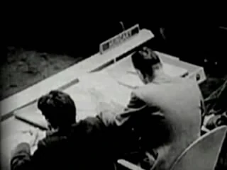 O zoom se afasta da imagem da DHARMA no final do Filme de Orientação para revelar que está sendo projetada para um grupo de pessoas com jalecos brancos. O cameraman está filmando através de um pequeno espaço entre o que parece ser grandes caixas.