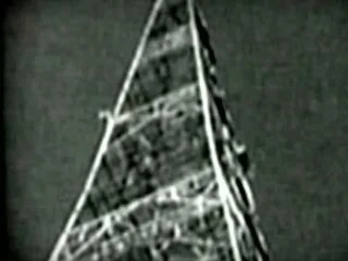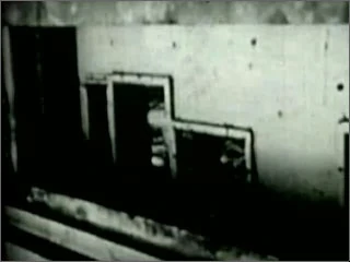 Primeiro segmento descoberto do discurso de Thomas Mittelwerk, filmado através de uma brecha estreita do que parece ser algum tipo de caixa ou contêiner..