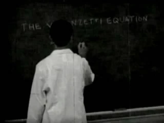 Um homem trajando um jaleco de laboratório pega uma caneta e escreve debaixa de outros escritos:"The Valenzetti Equation" no quadro.