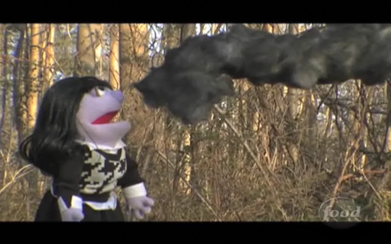 A Muppet-style Charm City Cakes employee faces the smoke monster