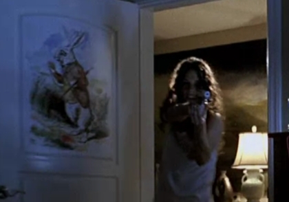 The white rabbit poster on Aaron's bedroom door.
