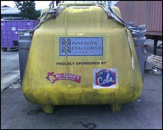 The balloon had an enclosed gondola with several metal cylinders attached and a hatch on top. The side of the gondola had a decal reading, "Minnesota Metallurgy & Mining Co." Under that were the words; "Proudly Sponsored By" with decals for Mr. Cluck's Chicken Shack and Nozz-a-La Cola.