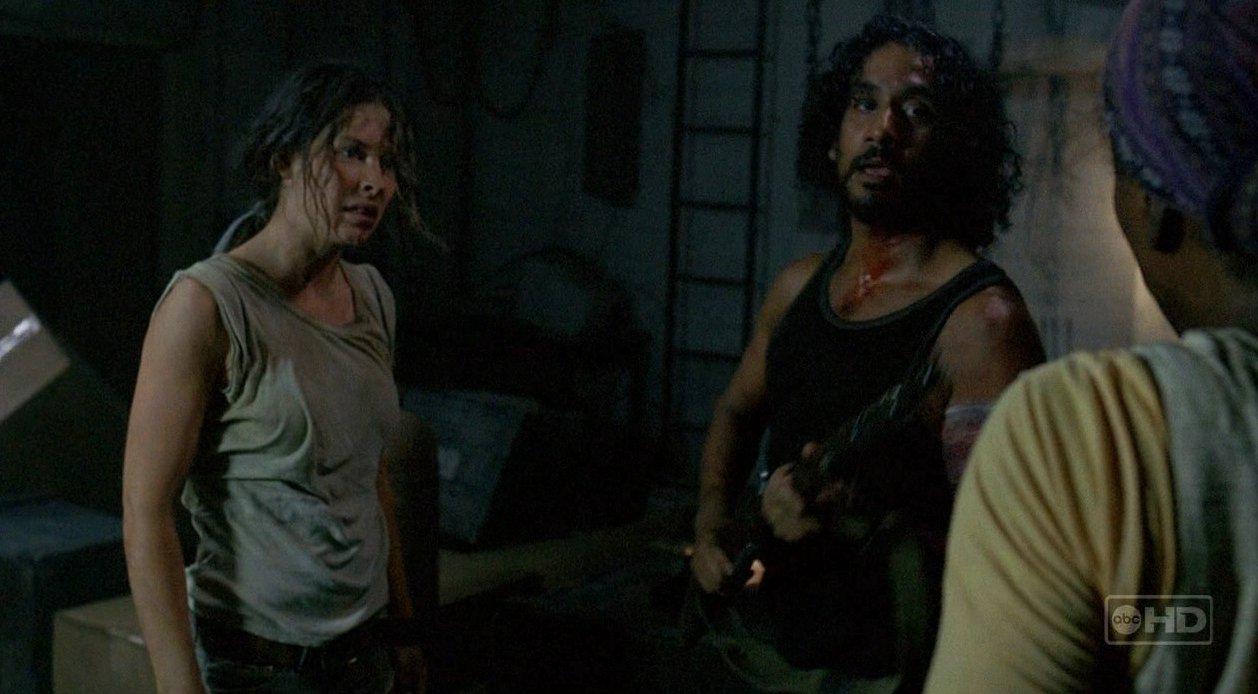 Sayid approached the Flame unarmed with his hands raised, indicating he had no weapon. He was shot in the shoulder by Mikhail, and a small firefight between Mikhail and the survivors ensued in which no one was injured. The survivors took Mikhail captive. Mikhail claimed that he was the last living member of the DHARMA Initiative. Inside of the Flame, Mikhail brought the survivors iced tea, and talked to the survivors about the DHARMA Initiative, the Hostiles, and the Purge. Sayid was convinced that Mikhail is not DHARMA, but he is one of them. Mikhail then attacks the survivors, but is overcome by Sayid and Kate. As the survivors discuss what to do next, Sayid reveals a hidden underground entryway that was concealed by a carpet.