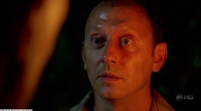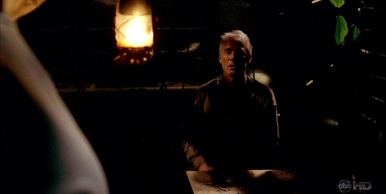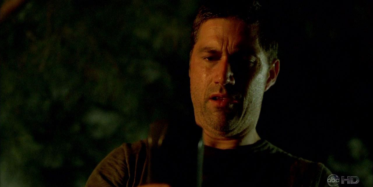 - Right after Locke goes into the cabin, the shadow of Hurley's arm holding the torch appears on Ben's shirt. As the camera zooms in, Hurley moves his arm, perhaps to cover the fact that the light isn't coming from the torch itself. (The torch wouldn't cast a shadow if the fire atop it were creating the light.)