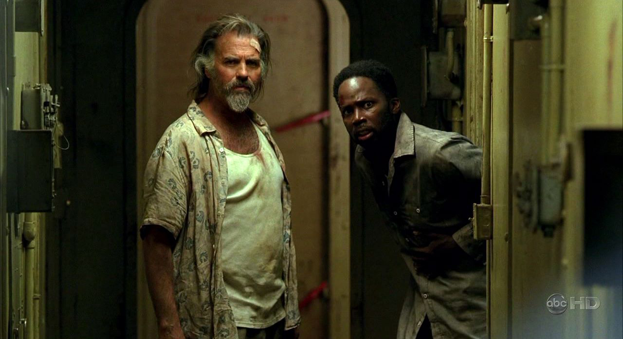 Desmond notices that the mercenary team's wounds are not caused by gunshots and wonders what has happened. Sayid is sure they won't let it happen again. ♪ Captain Gault walks to Desmond and Sayid and tells Omar, who stands guard, that Keamy wants him in the armory. Omar says he isn't supposed to let them out of his sight, but the captain replies, "I'll watch them." Omar leaves, while grabbing his phone, after hearing sets of beeps come over it (Morse code). The Captain then tells Desmond and Sayid to hide in a pantry under the galley. Sayid asks if Michael is dead, the captain answers no, but not through lack of trying - and that is exactly the reason they have to hide. Doc Ray can be seen in the background. Sayid asks for the ship's Zodiac raft saying the only way to save their lives is to get their people off the Island and on to the boat.