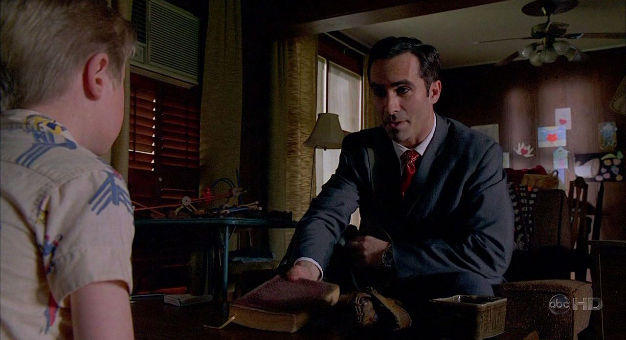 Richard tells John that he wants him to look at a few objects, think about them, and tell him which of them are his. The boy thinks Richard means "to keep" but Alpert clarifies, "Which of these things belong to you already?" He lays out on the table a baseball glove, a book entitled "Book of Laws", a small container of island beach sand, a compass, a comic book entitled Mystery Tales, and a knife. ♪ John immediately claims the container of the granules and inspects and then claims the compass. John starts towards the "Book of Laws", at which point Richard looks hopeful. Instead, he picks up the knife. Richard is disappointed and angry. He asks John if he is sure, and after he nods, Richard snatches the knife from his hand and takes the other items away. He puts these back into his bag and stands up quickly. Florence enters the room and asks how John did. Richard responds sternly that John is not quite ready for his school and walks out of the house. Florence scolds John, asking what he did wrong, as he looks down dejectedly. ♪