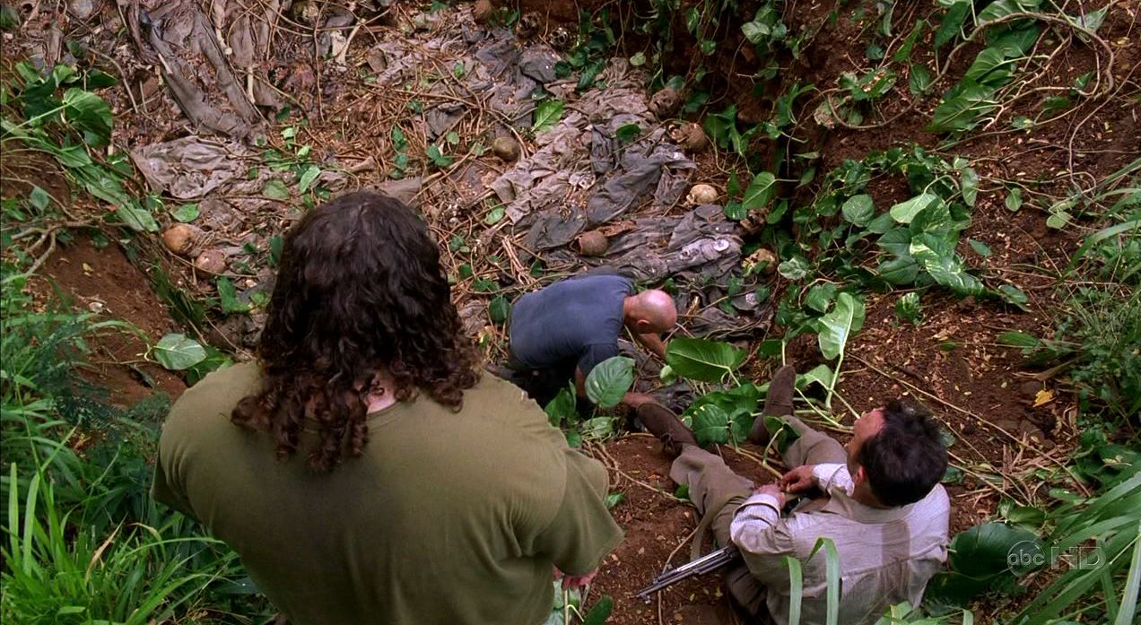 Locke leads Hurley to the mass grave of the DHARMA Initiative where Ben had left him for dead. ♪ Locke starts to search the bodies. Hurley asks Ben about killing these people. Ben states that he didn't kill them and that it wasn't his decision - it was the decision of the Others' leader. Hurley says that he thought Ben was the Others' leader. Ben responds, "Not always." Locke rummages through the bodies, reading the names on the jumpsuits until he finds the corpse of Horace Goodspeed. He opens the pocket on the jumpsuit and finds blueprints to a cabin and a map. Locke offers Hurley a chance to return to the beach, though it would be at night and alone. Instead, Hurley remains with them and as he moves out of earshot, Ben commends Locke's ability to force Hurley's choice. Locke denies being manipulative, stating to Ben, "I'm not you." Ben sarcastically agrees.