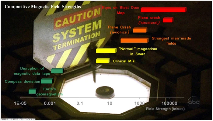Several equations, likely related to electromagnetism, were written on the blast door map. Two notations potentially alluded to fields with strengths of "104 T" and "106 T," (T is the SI abbreviation for tesla), though the exact interpretation of these two writings is somewhat unclear. If these referred to magnetic field strengths, they were unimaginably strong. Interestingly, 106 tesla is easily sufficient field strength to crash an airplane through shearing forces but the effects of such a field on the Island would involve actions unseen, such as levitation and destruction of non-metallic objects (likely the death of all life on the Island).
