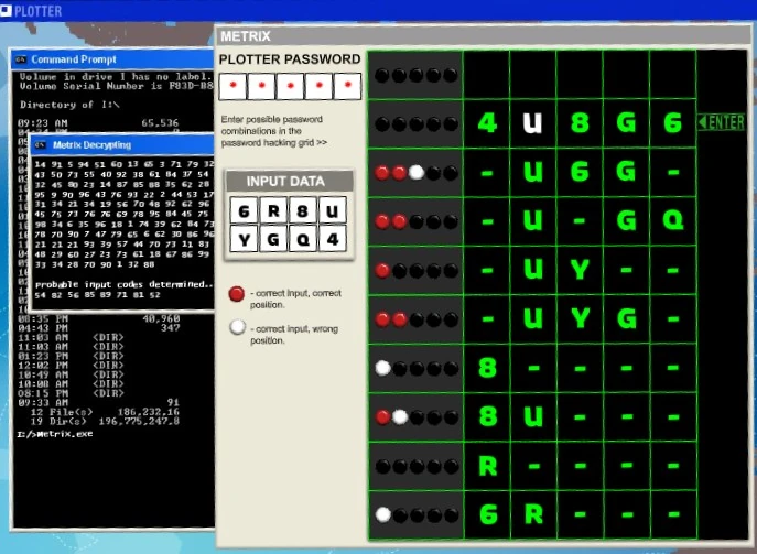 The player must attempt to break the chart plotter encryption by finding the correct password combination. Out of eight possible characters, the correct five must be found and placed in the correct position. The activity is based on Mastermind, a board game where a player attempts to break a code made up of a combination of colors.