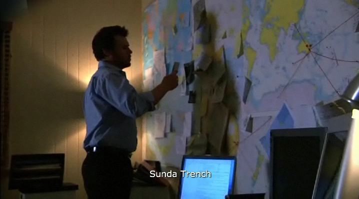 Sam gets up from his desk and goes to maps on the wall. He finds "Sunda" on a map, just east of Christmas Island.
