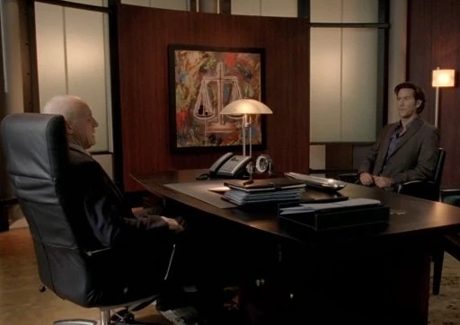 A painting of balanced scales in Widmore's office between Desmond and Widmore.