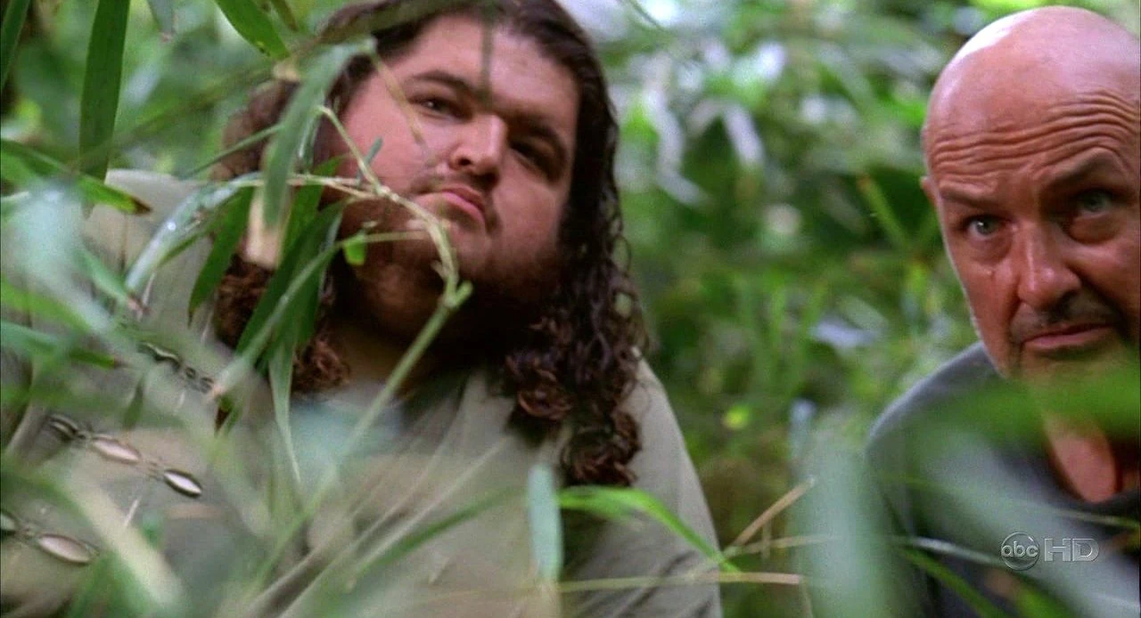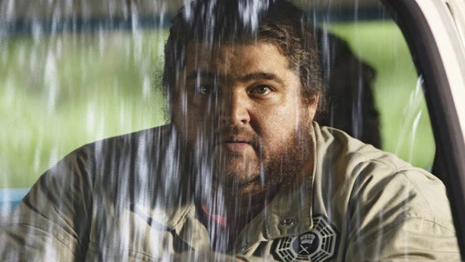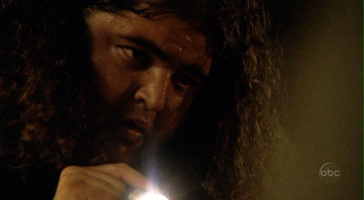 After rebuffing Sawyer's attempt to talk about Charlie's death, Hurley fell behind the group and got lost. He heard strange noises and whispers, then saw a cabin in the woods. He carefully approached and looked inside, seeing the darkened figure of a man in a rocking chair. Suddenly, an eye appeared in the window, causing Hurley to shout and run away. But after running some distance, he saw the cabin in front of him again. The cabin door creaked open. He closed his eyes and told himself that what he was seeing was not real, and when he opened his eyes, the cabin was gone. He tripped and fell on his back, and was surprised to look up and see Locke standing over him.