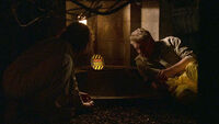 Soon after, Sun, Jin, and Sayid arrive at the Others' camp. When Sayid climbs up to the camp to investigate, he discovers that all the huts are abandoned. Sayid approaches the DHARMA station at the camp, and discovers there is only a rock wall behind the door.