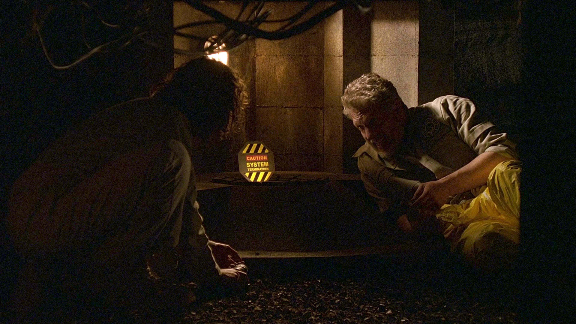 Locke and Desmond trick Eko into leaving the computer room by triggering a false blackout. The electrical buzzing is still strongly present in the Swan corridor. Desmond and Locke rush in the computer room, and lock Eko out with a false lockdown.