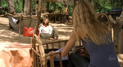 On their way across the jungle, Sawyer encounters a doll, but Kate prevents him from touching it, saying that he would be caught in a net. ♪ Sawyer then talks about his misunderstanding of Jack saying that he and Kate got caught in a net. Kate asks him since when he and Jack started talking about her.