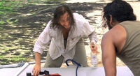 0415. Takes a shower. - According to Damon Lindelof and Carlton Cuse, there was originally supposed to be a scene where Sawyer was also wanting to go back with Hurley, thinking it was stupid to help Michael after what he did. Damon and Carlton wish they would have handled the feelings of the actors differently, but they just ran out of time. [1]