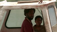 At the dock, Henry Gale closes the deal with Michael. ♪ "Henry" is not happy with the arrangement, but they got "more than they bargained for when Walt joined them." Since he lived up to his word, Michael is given the boat and Walt, and instructed to escape the Island by following a bearing of 325 degrees to find rescue. Michael wonders whether that is all. He asks Henry how he knows he won't tell anyone about the Island. But "Henry" replies that whether or not he tells people won't matter: once he has left the Island, he won't be able to come back. Anyway, "Henry" believes that Michael won't tell anyone, because if he does, people will find out what he did to get his son back. ♪ Michael is reassured that his friends would not be hurt as a deal's a deal. Finally, Michael asks "Henry" - "Who are you people?" "Henry" replies, "We're the good guys, Michael." As Michael is reunited with his son on the boat, "Henry" adds, "Bon voyage, Michael." ♪ Michael leaves Jack, Sawyer, Kate and Hurley stare at him and Walt also sees the bound and gagged kneeling prisoners with guns pointed at them.