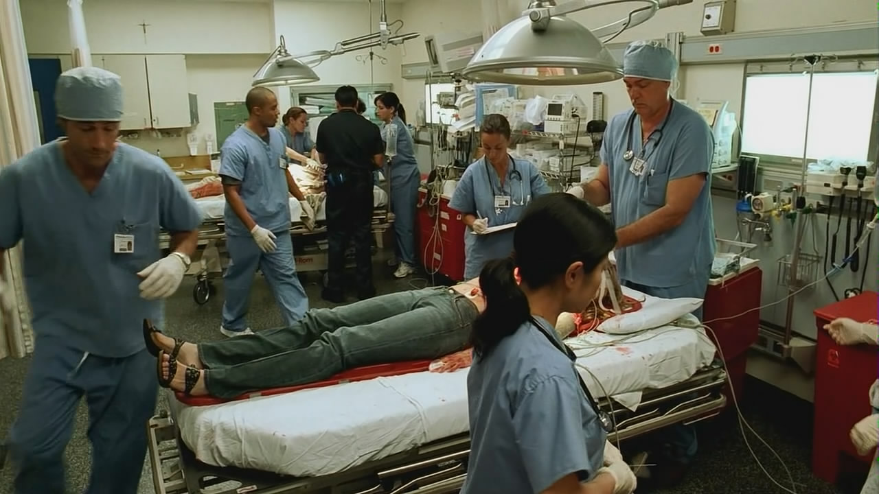 Early in the morning at St. Sebastian Hospital, two victims of a car accident are brought in. The female victim, Sarah, is first pushed through the ER on a stretcher with a piece of steering column sticking out of her chest. Jack walks in as the surgery immediately turns to action. The paramedic informs Jack what had happened: "Tire blew, car jumped the divider, went head-on with an SUV." As Jack asks where the driver of the SUV is, a second stretcher containing Adam Rutherford is steered into the ER. Jack has to make a decision, whether to operate on Adam or the woman. Jack focuses his attention on the woman and as he saves her life, Adam dies on the table with the time of death at 8:15 AM. The woman is saved, and after Jack is about to leave the ER she mumbles. The interns question what she said and Jack says, "She said 'she has to dance at her wedding.'" Jack leaves and the woman continues to mumble the same words. ♪