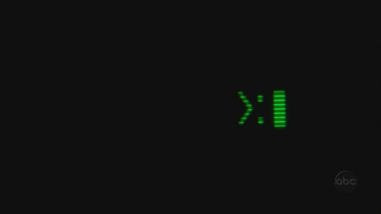Back at the caves, Jack arms himself, deciding that he is going after Kate and Locke. At the Hatch, he finds no one there. ♪ He rappels down the shaft and finds a maze of passageways. He comes across a colorful mural painted on the wall featuring the Numbers, including their sum, 108, prominently in the center of a sun. He also discovers a spot where the key to the Halliburton case he carries around his neck is pulled up, attracted by a strong magnetic force. ♪ Finally, after being surprised by a bright light and loud music, he enters what appears to be an underground geodesic dome. ♪ It contains an array of computer equipment from various decades, including an Apple II computer, its prompt glowing. As Jack is about to use it, Locke appears and tells him not to touch it. Jack raises the gun and asks, "Where's Kate?" Locke does not answer, as the resident of the Hatch has a gun pointed at Locke's head.