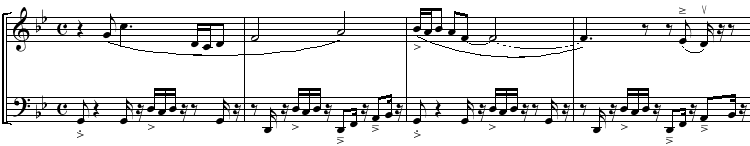 An example of one the leitmotifs is "Hollywood and Vines" (Soundtracks). This theme has appeared several times ("Pilot, Part 2") ("Exodus, Part 2") ("Abandoned") ("Through the Looking Glass, Part 1") ("Cabin Fever") ("Follow the Leader"), and is used when characters are trekking across the Island (often to higher elevation). It opens with a recognizable and prominent bass figure, which is phrased in a syncopated rhythmic pattern, giving it a somewhat staggered feel. Its minor key, low register, and heavy reliance on the tonic and dominant notes of the scale add to it a tone of fortitude and gravity.