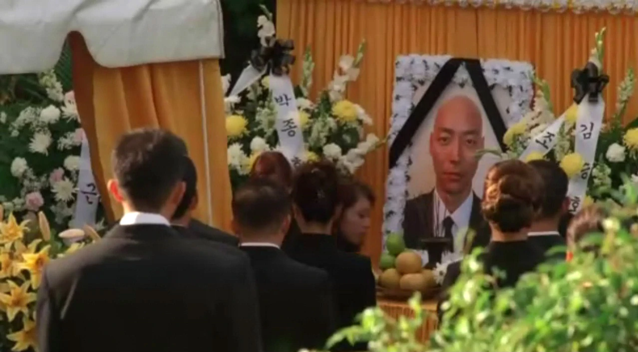 In a flashback, Sun attends Jae Lee's funeral. Her father stands next to her, and they refer to her infidelity.