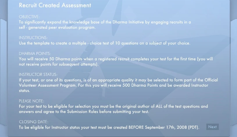 On September 10, the Dharma Initiative launched the Recruit Created Assessment project, allowing recruits to produce their own multiple choice exams (similar to Test 2) on any topic, which they can then issue to other recruits. Playing another recruit's test gains the creator 50 Dharma points.