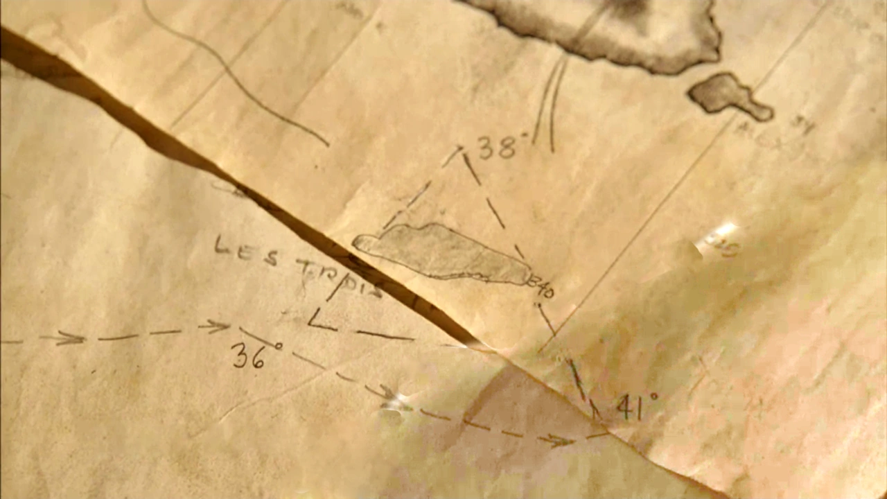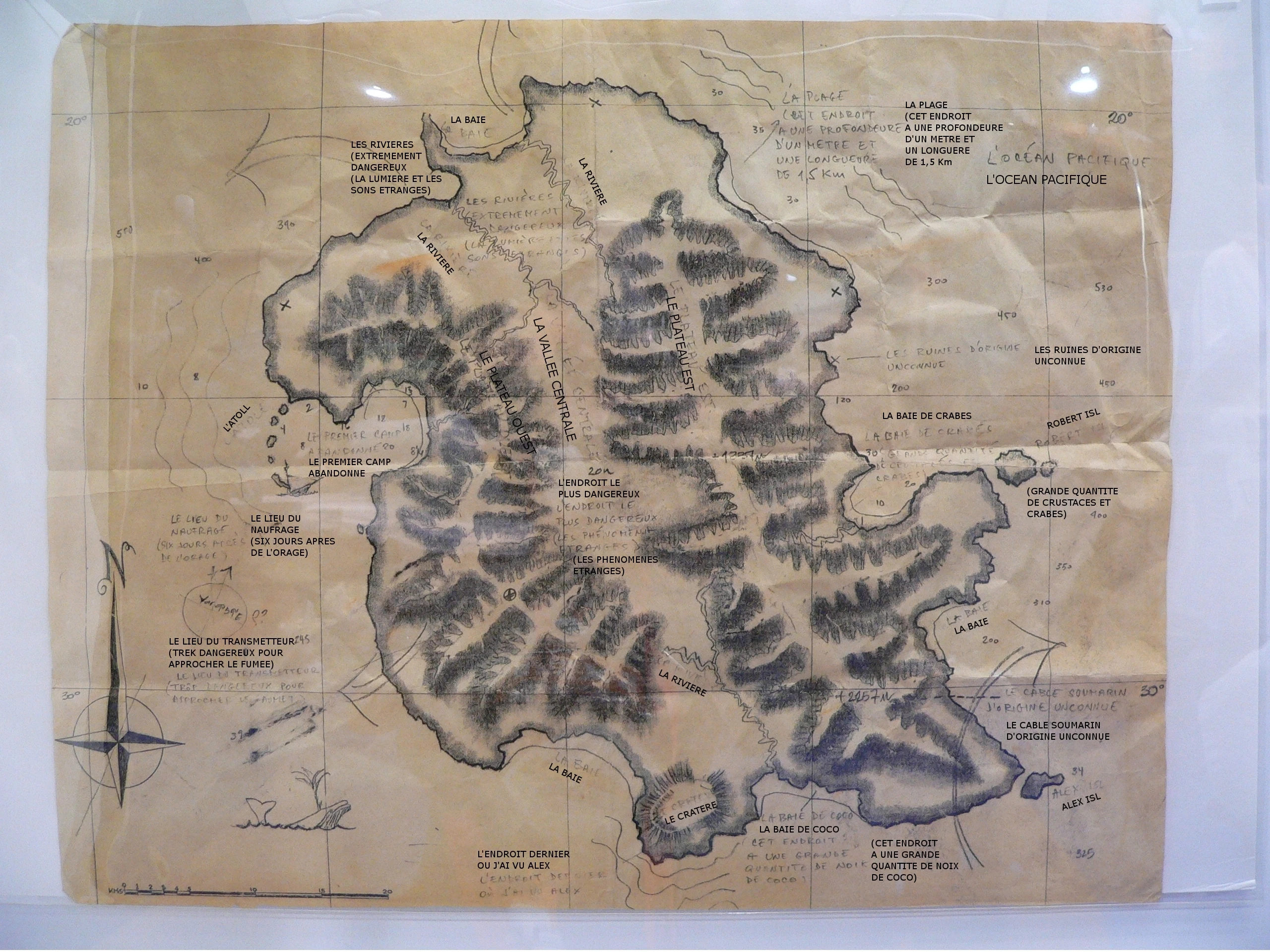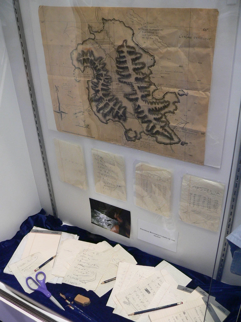 Danielle Rousseau kept several maps and notes that she had made or acquired during her 16 years on the Island, containing diagrams, maps, equations, and various notations. Sayid, after escaping imprisonment at Rousseau's camp, took the maps and notes with him back to the survivor's camp. ("Solitary") He recruited Shannon to help translate the French notations that accompanied the mathematical equations on the maps and notes. Some of the notations that originally appeared to Shannon to be gibberish were later tranlsated as lyrics to the song "La Mer", from an animated children's movie. ("Whatever the Case May Be") Sayid retained possession of the pages, excepting a brief period during which Hurley took some of them, until he left the Island. ("There's No Place Like Home, Part 2") ("Numbers") Not long after the crash of Ajira Airways Flight 316 on the Hydra island, one of its survivors, Caesar, found what appeared to be a folded up version of Rousseau's map. ("The Life and Death of Jeremy Bentham")