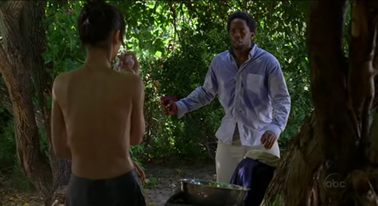 In Sun's flash sideways, she caught sight of Locke when recovering consciousness and briefly mistook him for the Man in Black.