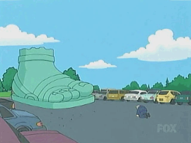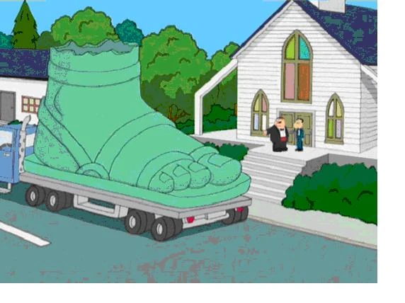 The Family Guy foot wears a sandal and is claimed to be the foot of the Statue of Liberty, which Peter has obtained as a gift for Quagmire's marriage at the cost of $437,000. However, in the image below it is apparent that the Family Guy Statue is entirely dissimilar to the actual foot of the Statue of Liberty. The foot should be taken to exist as the Statue of Liberty's foot in the world of Family Guy though, as it drives Adam West's character into performing Charlton Heston's final lines from Planet of the Apes.