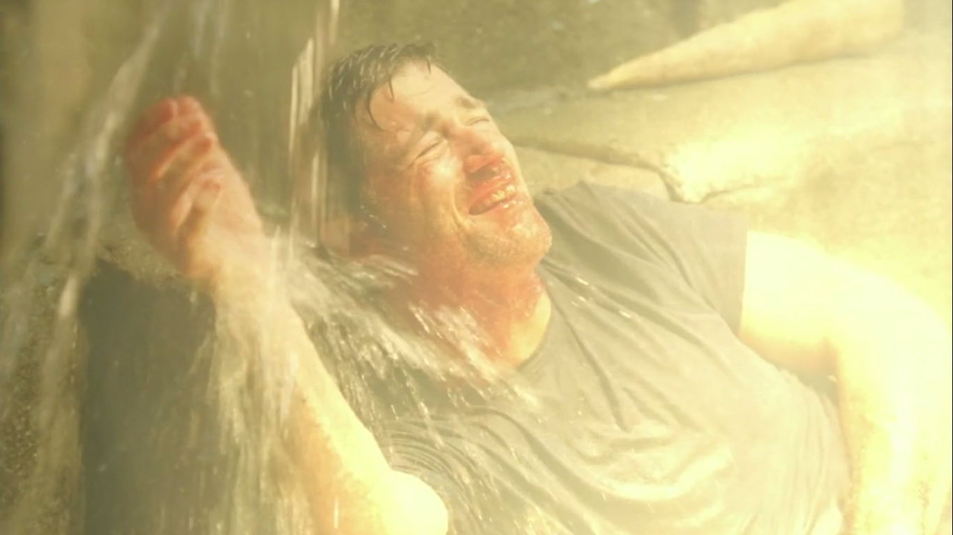 Jack lies exhausted in the empty pool but a trickle of water starts flowing and then the light starts to return. Hugo and Ben haul on the rope and find Desmond on the end of it. Hurley starts calling for Jack, but doesn't receive any response. Below, Jack sobs with relief as he is engulfed in the light. ♪♪