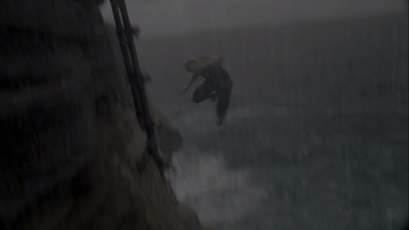 Locke stands on the cliff above the cliffside cave, looking at the Elizabeth anchored a short distance offshore. Before he can make it to the boat, Jack catches up to him, mad as ever. Locke turns around and the two face each other for the final showdown. Locke draws his knife and they run at each other across the uneven ground. ♪ Jack leaps at Locke and they fight as the storm rages and cliffs disintegrate.