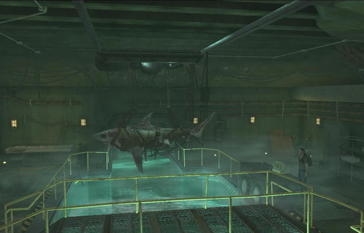 In this room there is a large aquarium that contains two large shark tanks adjacent to each other. Above the tank there is a large metal machine that can carry the sharks and suspend them in mid-air. The staging tank has a code name which is DIHS-ST1. ("Worth A Thousand Words")