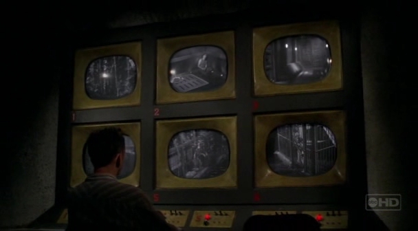 Also in the underwater section of the Hydra is a small observation room. Appearing similar in design to the bank of monitors at The Pearl station, the room has six monitors, each equipped with live video and audio. Each camera has its own control panel with two knobs, three switches and a small red light. From here one can monitor different areas of Hydra Island, including underwater rooms and, above-ground, the walkways, the operating room and the cages. A gun locker is located nearby containing 3 SKS rifles, three Walther P-38 pistols and several boxes of ammunition. This weapons locker is far smaller than that at The Swan. Tom referred to the area as "the surveillance room". ("Stranger in a Strange Land")
