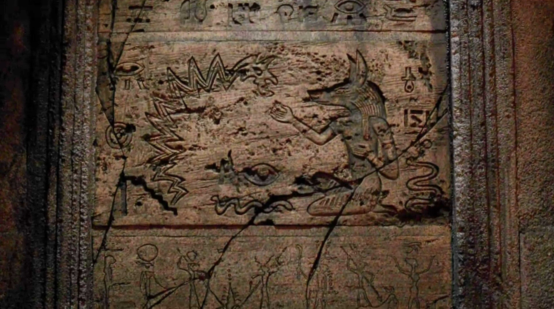 Evidence suggests an early Egyptian presence on the Island. A Statue of Taweret stood until the mid 19th century. Hieroglyphs remain on many ancient structures, including the cork, the Temple, the Tunnels, the Lighthouse, and Ben's secret room. The Egyptians encountered the Monster in some incarnation - they engraved a mural depicting it with Anubis. It's possible that they also discovered and completed the frozen wheel the Man in Black built. At an unknown time, they seem to have left the Island; Jacob's tapestry, which features Egyptian iconography, depicts sailboats departing from the Island with the Statue of Taweret visible on the shore, leaving a rich legacy to later groups. Besides Jacob's tapestry, the DHARMA Initiative used hieroglyphs to indicate a system failure on the Countdown timer in the Swan and taught students about hieroglyphs in the classroom.