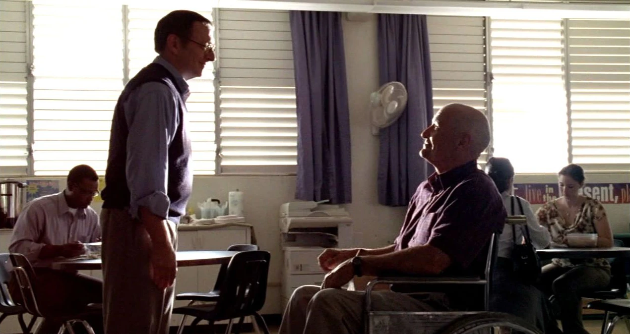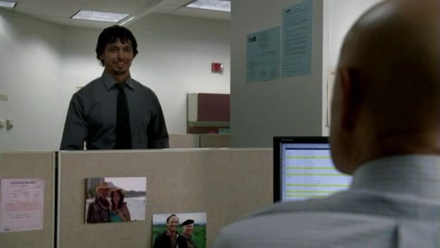 After returning to his desk at the box company, John is confronted by his boss, Randy, who questions him about missing a lunch with Ken Fisher whilst at a conference in Sydney which John lies about attending. Randy reveals he knows John did not attend the conference to which he had been sent and subsequently fires him. In the parking lot, John is unable to get into his van, which he had parked in a regular spot, as opposed to a handicapped spot. He tries to scratch yellow Hummer that blocks his access with the wheelchair lift, but it malfunctions a second before hiting the car. Locke then pounds on the Hummer, causing the car's alarm to go off. Hugo steps out of the building, telling John that he is the owner of the company. ♪ After introducing themselves, John tells Hugo that he has been fired by Randy, whom Hugo calls “a huge douche.” Hugo offers to talk to Randy and make him re-hire Locke, but he declines. Hugo then gives John the number to a temp agency (which he also owns) before telling him that “things are gonna work out.” ♪