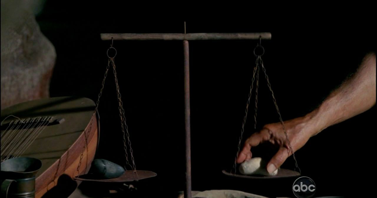 - The camera angle shows the scale splitting the screen of the Man in Black and Sawyer with Sawyer on the side of the black stone (the right) and the Man in Black on the other (the left) where the white stone is—and later, was. (Black and white)